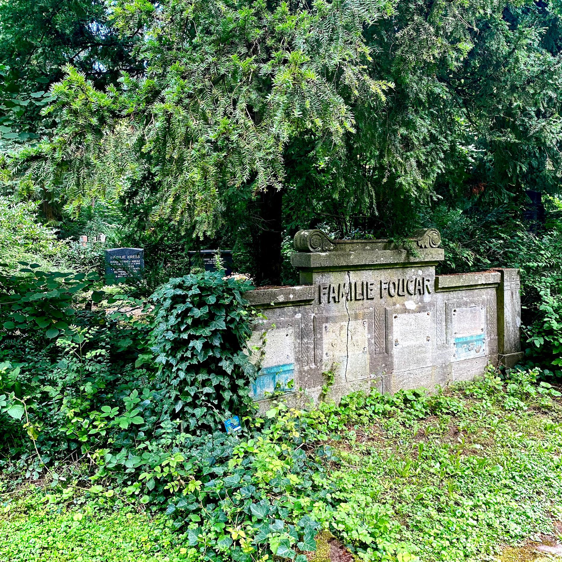 Meine Wahl fiel auf einen Stein, der mich nicht nur aufgrund seiner Größe, sondern vor allem wegen der Schönheit seiner Blessuren beeindruckte. Über meine Paten-Toten wusste ich anfangs nicht viel: »Familie Foucar« steht auf dem Stein, buchstabiert in einer eleganten Art-déco-Schrift. Durch die »Familie« ging ein Riss, das Bein vom M war angebrochen. Die Metallplatten mit den vollen Namen der Toten, vor langer Zeit gestohlen, wie ich später erfuhr, haben blaue Flecken und Spuren von Korrosion auf dem grauen Muschelkalk hinterlassen.
